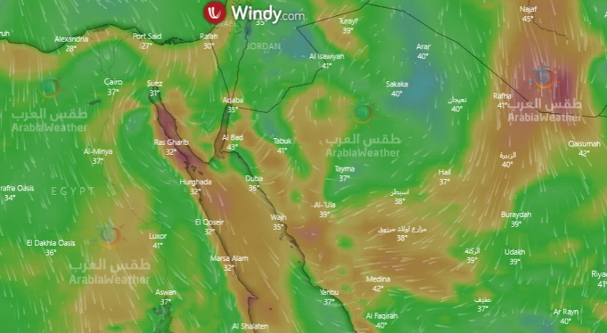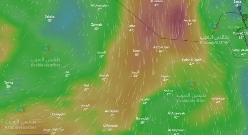 وتُشير الخرائط الجوية إلى هبوب رياح شمالية "نشطة أحياناً" خاصة في ساعات مابعد الظهر والعصر على المنطقة الواقعة ضمن مثلث "رفحاء - حفر الباطن - حائل"، وقد تعمل على إثارة الأتربة والغبار بشكل محلي وغير مؤثر.