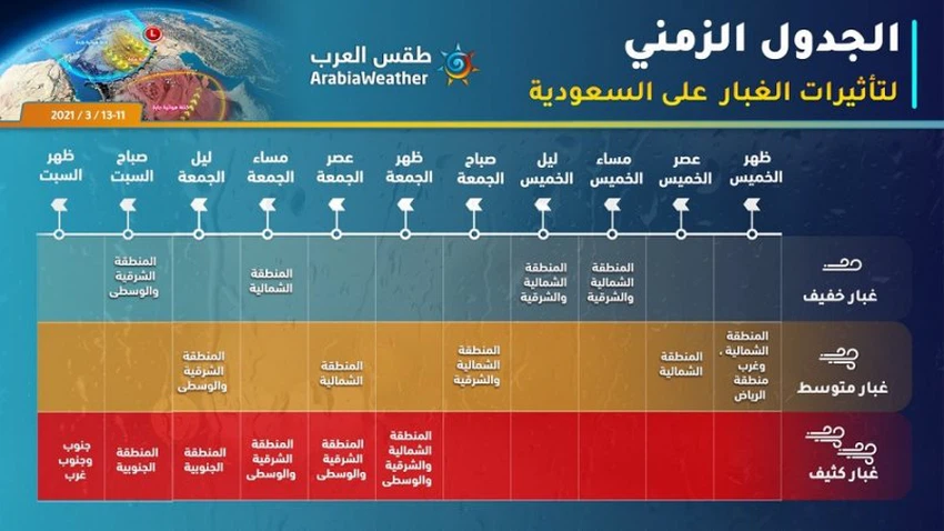 فيما يلي تصميم يتضمن تفاصيل التسلسل الزمني للعواصف الرملية والأجواء المُغبرة و المناطق الأكثر تأثراً بها