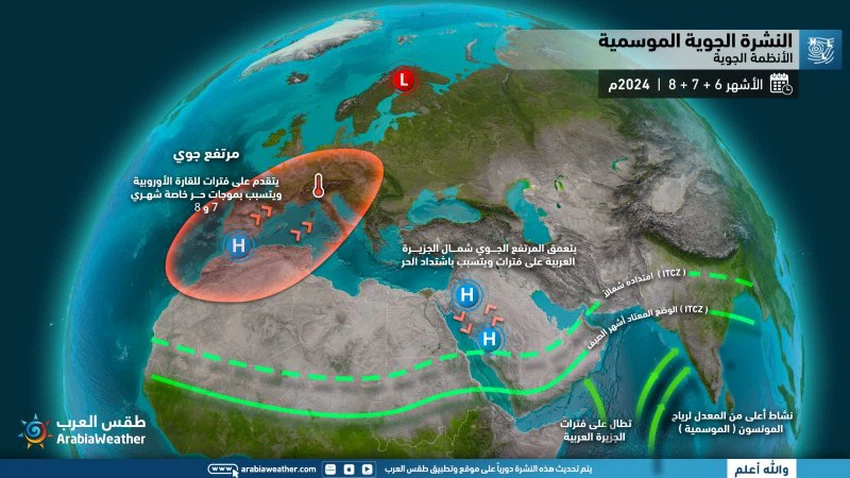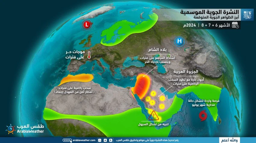 طقس العرب - سنان خلف - أصدر فريق التنبؤات الجوية في "مركز طقس العرب الإقليمي" قبل قليل توقعات الطقس بعيدة المدى، والخاصة بفصل الصيف لهذا العام 2024م، وتشمل التوقعات الأولية لدرجات الحرارة وتوقعات الأمطار وانحرافها عن معدلاتها لأشهر (يونيو و يوليو و أغسطس) على النحو التالي: