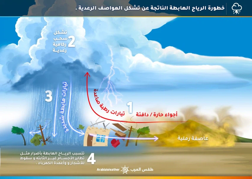 تتشكل العواصف الرملية أحياناً نتيجة لما يعرف مناخيا "بالرياح الهابطة" وهي رياح قوية تهبط من السحابة الركامية وتضرب الارض بشكل عمودي، تتشكل على إثرها موجة غبار تنتشر بشكل دائري وتتوسع وتأخذ شكل سحابة بنية ضخمة مهيبة الشكل.