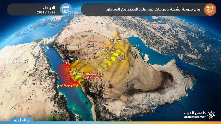 أما يوم الأربعاء فيُتوقع ان تتسع رقعة تأثير الرياح القوية والغبار لتشمل كُل من الجوف والحدود الشمالية ومنطقة حائل والقصيم وحفر الباطن، ووصولاً حتى شمال منطقة الرياض، كما تشمل مدينة جدة ومكة المكرمة والمدينة المنورة، وقد تؤثر على أجزاء من شمال المنطقة الشرقية والله اعلم.