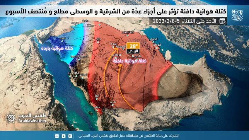 و تُشير آخر القراءات الجوية بأن كتلة هوائية باردة و هي ذات أصلٍ قُطبي يُتوقع أن تندفع للمملكة تدريجياً يوم الثلاثاء و تشمل في حينها أغلب المناطق الشمالية و الشمالية الوسطى، و يمتد تأثير هذه الكتلة نهاية الأسبوع و يطال بذلك تأثيرها أغلب مناطق المملكة، بحيث يطرأ انخفاض لافت على درجات الحرارة في مناطق تبوك و الحدود الشمالية و حائل و القصيم و حفر الباطن و الشرقية و الرياض.