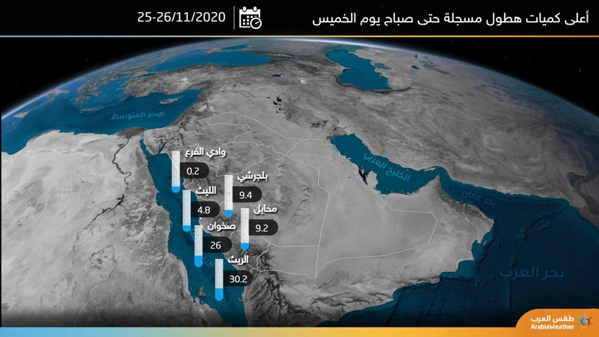توقعات طقس العرب فيما يتعلق بفرص الأمطار على كل من الرياض وجدة خلال الحالة الماطرة سقيا