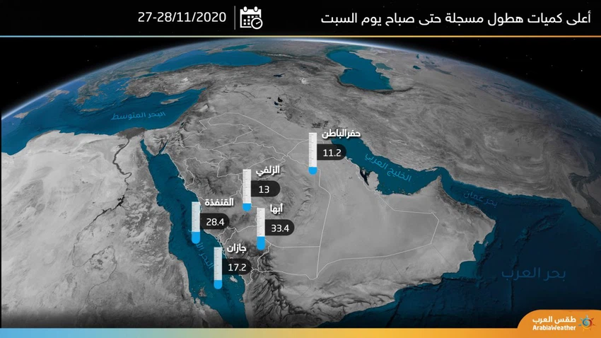 في حين هذه كانت أعلى كميات سُجلت في كل من مكة المكرمة، عسير، المدينة المنورة والباحة: