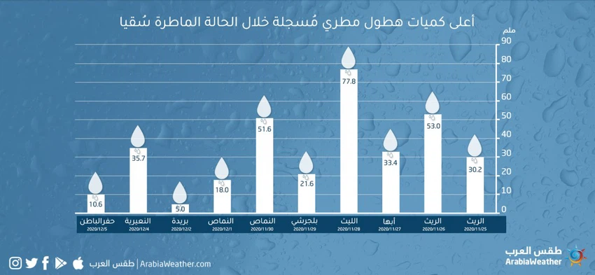 طقس العرب - تأثرت المملكة العربية السعودية بحالة ماطرة واسعة النطاق واستمرت لعدة أيام، وقد أطلقت لجنة التسميات على هذه الحالة الماطرة اسم (سُقيا)