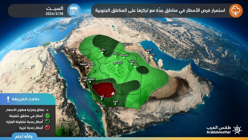 طقس العرب - سنان خلف - تتأثر الأجزاء الجنوبية الغربية من المملكة يوم السبت بمشيئة الله بأحوال جوية غير مستقرة وسحب ركامية رعدية، تعمل على تساقط الأمطار بمشيئة الله.