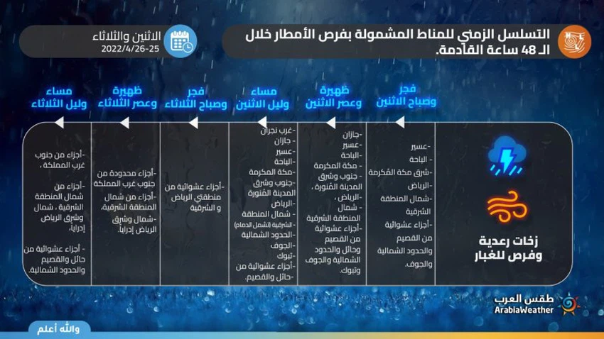 وبحسب ما تُشير إليه مُخرجات النمذجة الحاسوبية المُطورة من قبل طقس العرب فإن تعمُقاً مُنتظراً للمُنخفض الجوي العُلوي لأجواء المملكة يوم الإثنين 25-4-2022، تزامُناً مع استجابة فعالّة لمُنخفض البحر الأحمر وتمدده لوسط وشرق السعودية والدول المُجاورة، مما يعني تكاثر السُحب الرعدية وهطول زخات أمطار بشدة متفاوتة في أجزاء عديدة من المملكة، ومن المُتوقع أن تشمل السُحب الركامية الرعدية أجزاء واسعة من القطاع الجنوبي الغربي من المملكة بما في ذلك غرب نجران وجازان وعسير والباحة ومكة المُكرمة ولا يُستبعد أن تُطال فُرص الأمطار المشاعر المُقدسة. كما وتشمل فُرص الأمطار أجزاء من جنوب وشرق المدينة المُنورة، وأجزاء واسعة من منطقة الرياض بما في ذلك العاصمة، بالإضافة إلى المنطقة الشرقية خاصةً القطاع الشمالي منه بما في ذلك حفر الباطن والدمام، ووصولاً لأجزاء عديدة من الحدود الشمالية والجوف وتبوك وبشكلٍ أقل القصيم وحائل خاصةً شمالها.