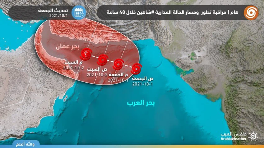 مع الاحترار الواضح لمياه شمال بحر العرب، يبدو بأن العاصفة شاهين ستجد الطريق سالكاً غرباً فوق المياه الدافئة التي تبلغ 30 درجة مئوية وهي درجة مناسبة لتغذية الحالات المدارية وتطورها، وضخ كميات هائلة من الرطوبة والطاقة لتواصل العاصفة تحركها نحو بحر عُمان. وهو المسار المرجح بحسب تحديثات صباح يوم الجمعة 1-10-2021