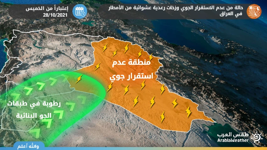 يتزايد تأثر العراق بحالة من عدم الاستقرار الجوي يومي الجمعة والسبت، ويكون ذلك على شكل ظهور كميات كبيرة السُحب على ارتفاعات مختلفة لاسيما المُتوسطة والعالية، حيث يكون الطقس غائماً جزئياً إلى غائم في بعض المناطق، يتخللها سُحب ركامية مع هطول زخات رعدية من الأمطار في نطاقات جغرافية ضيقة وعشوائية خاصة في المناطق الشمالية والشرقية، تكون الامطار مُتفاوتة الشدة، ولا يُستبعد ان تكون غزيرة أحياناً مما يتسبب بتشكل السيول، وتكون الأمطار مصحوبة بالعواصف الرعدية، ورُبما تساقط زخات من البَرَد.