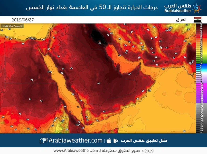 ويُتوقع بمشيئة الله أن تتجاوز درجة الحرارة حاجز الـ 50 درجة مئوية في العديد من المناطق بما فيها العاصمة العراقية، وتسود أجواء لاهبة ومرهقة، لذا يُنصح بتجنب التعرض المُباشر والطويل لأشعة الشمس والإكثار من شرب السوائل المرطبة.
