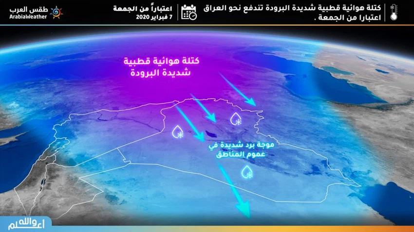 تبدأ الكتلة الهوائية القطبية الأكثر برودة بعبور اجواء العراق اعتبارا من يوم الاحد و تنخفض درجات الحرارة بشكل كبير و اضافي وتكون ما دون الصفر المئوي في العديد من المناطق، وتشير آخر التحديثات الى احتمالية ان تسجل درجات الحرارة قيم قسياسية و استثنائية في شمال العراق فجر الثنين مع توقعات بأن تهبط درجات الحرارة الى ما دون 15 درجة مئوية تحت الصفر فوق القمم الجبلية العالية ، فيما تهبط درجات الحرارة في مدينة الموصل الى 7 درجات مئوية تحت الصفر وتكون ما دون 5 درجات مئوية تحت الصفر في عموم المنطقة الغربية.