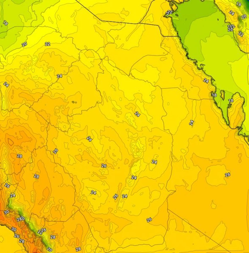 وتتراوح درجات الحرارة الصغرى خلال ساعات الليل من 10 الى 12 درجة مئوية فوق العديد من المناطق تزامناً مع حدوث ارتفاع على نسب الرطوبة.