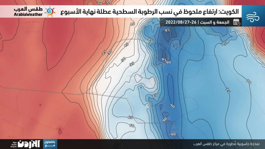 طقس العرب - تُظهر الخرائط الجوية توقعات بتراجع وطأة الحر عن الدولة يومي الجمعة والسبت 26 و27 أغسطس 2022، إلا أن ارتفاعاً ملحوظاً سيطرأ على نسب الرطوبة السطحية في الأجواء بمشيئة الله.