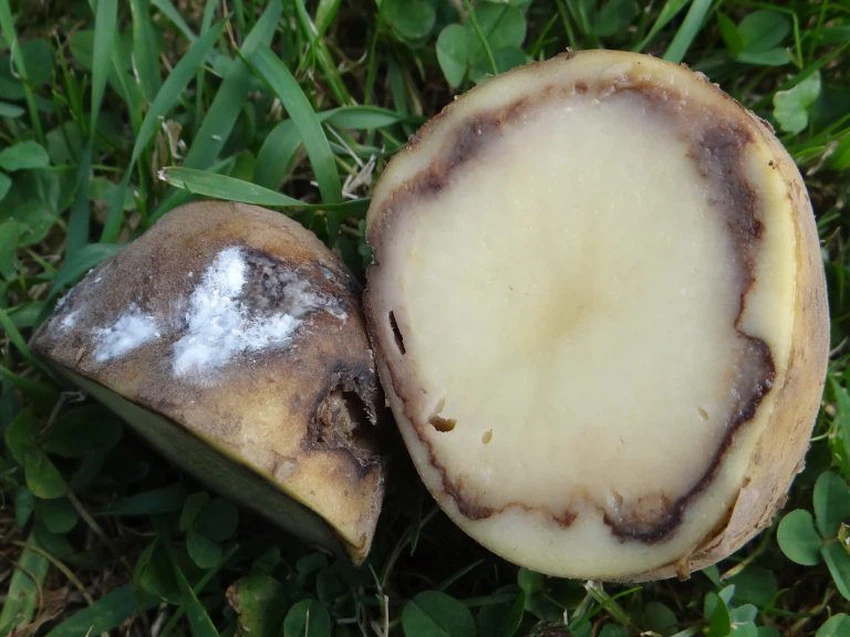 ينتج مرض اللفحة المتأخرة عن فطر يسمى فيتوفثورا إنفستنس (Phytophtora Infestans)، وعادة ما تكون القمة النامية والزهور والسيقان الصغيرة هي الأكثر عرضة للإصابة والتعفن، حتى يصل العفن إلى أجزاء كبيرة من النبتة وتموت في النهاية، وتبدأ أعراض المرض غالباً على حواف أوراق النبات على شكل بقع بنية غير منتظمة، ثم تعم بقية أجزاء الورقة مع ظهور زغب أبيض، إذ يحمل هذا الزغب أبواغ الفطر التي يتكاثر الفطر من خلالها عندما تحمله الرياح أو المياه، وعندما تصل الإصابة إلى ساق النبتة يتقرح حتى يجف ويتحول للون البني، أما الثمار فتتمثل الأعراض عليها ببقع مائية تتسع بسرعة لتشمل كل الثمرة.
