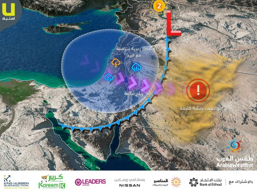 يتعمق المُنخفض الجوي فوق الاراضي السورية، حيث تعبر المملكة في ساعات مُنتصف ومابعد مُنتصف الليل جبهة هوائية عالية الفعالية، ستعمل "بمشيئة الله" على حدوث اشتداد كبير في سرعة الرياح حيث يتحول الطقس ليصبح عاصفاً وتصل سرعة هبات الرياح إلى مايقارب الـ 110كم/ساعة الامر الذي سيعمل على حدوث عواصف رملية وموجات غُبارية في عموم المناطق الصحراوية من المملكة.