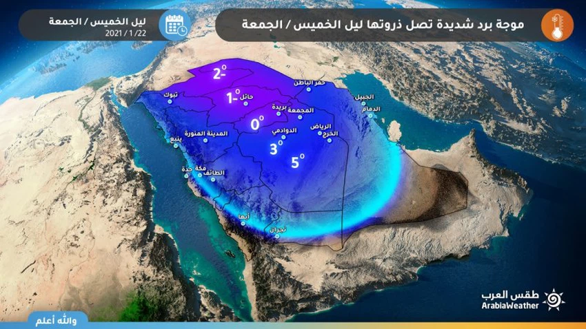 ويُتوقع أن تُسجل الأجزاء الشمالية من المملكة وبشكل خاص الجوف والحدود الشمالية ومنطقة حائل ليلة الخميس/الجمعة درجات حرارة ما بين الصفر المئوي إلى درجتين تحت الصفر، في حين تكون مابين الصفر المئوي إلى ثلاث درجات في القصيم، وترتفع عن ذلك لتكون ما بين ثلاث درجات إلى خمس درجات مئوية في الرياض والمنطقة الشرقية.