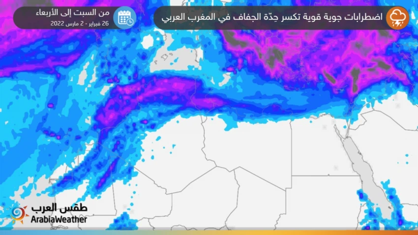 ويُتوقع بإذن الله أن تتشكل السحب الرعدية الماطرة في عموم الأجزاء الشمالية من المغرب يوم السبت 26-02-2022 اضافةً إلى أجزاء عشوائية ومحلية من غرب الجزائر، على أن تتركز الإضطرابات الجوية يوم الأحد فوق جبال الأطلس في المغرب والمناطق المحيطة بالجبال وفي ذات الوقت تتسع رقعة الأمطار على أجزاء واسعة من شمال الجزائر، وتهطل الأمطار بغزارة على فترات، مصحوبة بالبرق والرعد وربما تساقط لزخات من البرد، مع فرصة عالية نسبياً لتشكل السيول، خاصة على المنحدرات الجبلية.