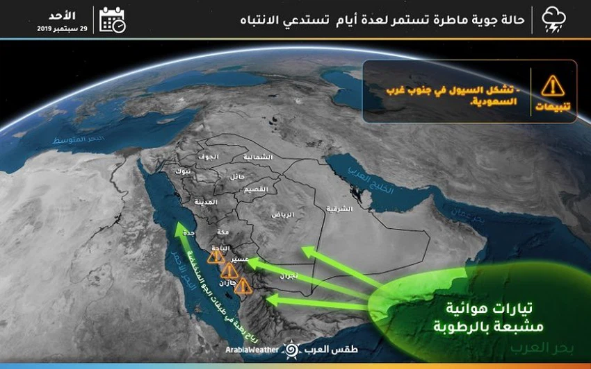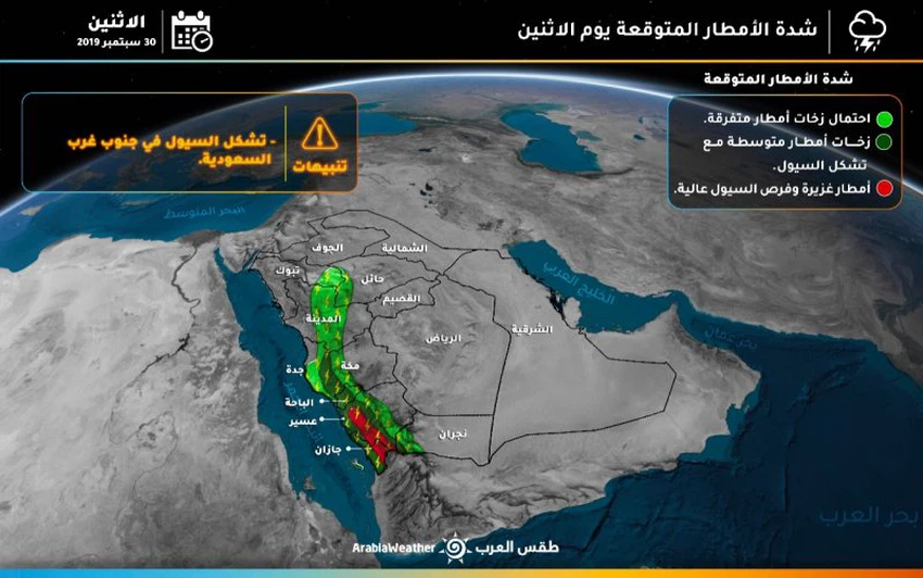 ويُنبه كادر التنبؤات في طقس العرب من غزارة الامطار المُتوقعة وخطر تشكل السيول في مرتفعات جازان وعسير وربما بعض المنحدرات الغربية، كما ويُحتمل تشكل السيول بدرجة أقل في مرتفعات الباحة والطائف.
