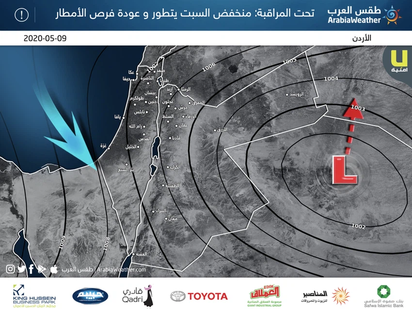 تأثرت المملكة بتاريخ 9 أيار/ مايو 2020 بمنخفض ترافق بكُتلة هوائية باردة نسبياً، ترافق بانخفاض حاد و ملموس على درجات الحرارة لتُصبح أقل بكثير مما هو مُعتاد عليه لمثل هذا الوقت من العام ونشاط الرياح وهطول زخات رعدية من الأمطاروموجات غبارية كثيفة.( مرفق بفيديوهات للامطار والغبار)