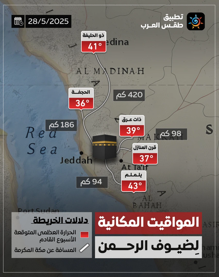 طقس العرب - مع اقتراب موسم الحج، يتجدد الحديث عن المواقيت المكانية التي حددها النبي محمد ﷺ، وهي نقاط جغرافية يجب على كل من نوى الحج أو العمرة أن يُحرم منها عند المرور بها، ما لم يكن من أهل مكة أو من كان داخل حدود الحرم.