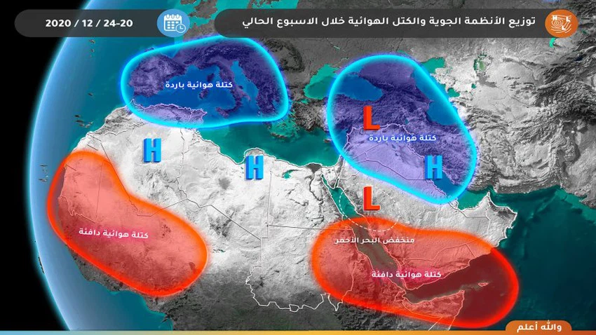 طقس العرب - يتوقع أن تتوزع الأنظمة الجوية خلال الأسبوع الحالي في عموم مساحة الدول العربية بين مرتفعين جويين ومنخفض جوي ضحل فوق شمال ليبيا ومنخفض البحر الأحمر و كتلتين هوائيتين باردتين إحداهما في وسط المتوسط والثانية فوق العراق وبلاد الشام وشمال الجزيرة العربية.