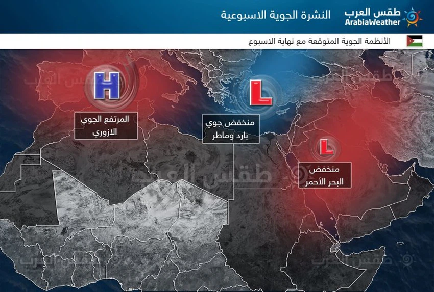 وخلال تلك الفترة (يومي الخميس والجمعة) ، يحتمل أن يتمدد منخفض البحر الاحمر نحو جنوب وشرق الاردن، يترافق مع تكاثر السحب الركامية الجافة، بالتزامن مع وقوع المملكة على أطراف الحوض العلوي البارد، مما قد يزيد من فرص الأمطار المتفرقة لاسيما شمال المملكة.