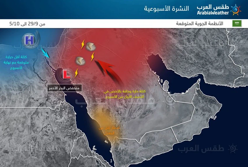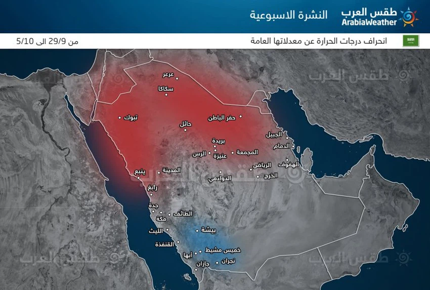 وكنظرة عامة على الاسبوع، تكون درجات الحرارة أعلى من معدلاتها في شمال وشمال غرب المملكة وحول الى أعلى بقليل شرق المملكة، فيما تكون قريبة من المعدلات العامة الى أقل بقليل في غرب ووسط المملكة.