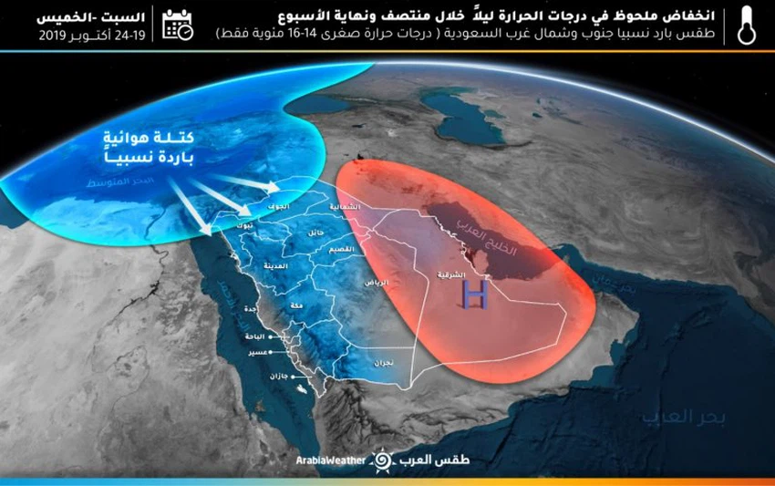 ويزداد اندفاع كتلة هوائية باردة نسبياً نحو شمال غرب السعودية لاسيما مع الأيام الاخيرة من الاسبوع، ليصبح الطقس بارداً نسبياً مع ساعات الليل والصباح الباكر بشكل أوضح خاصة في غرب الجوف و غربالحدود الشمالية وأجزاء من تبوك.