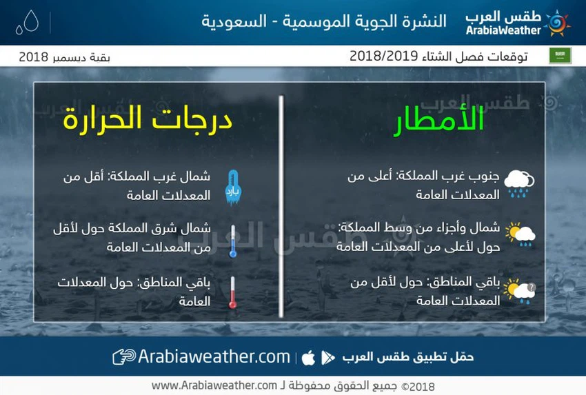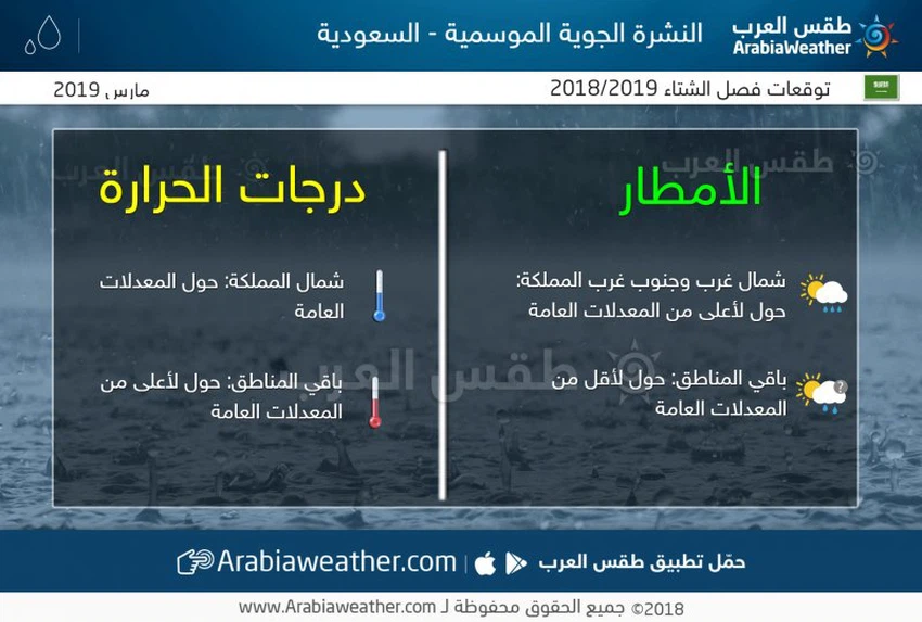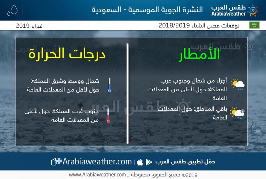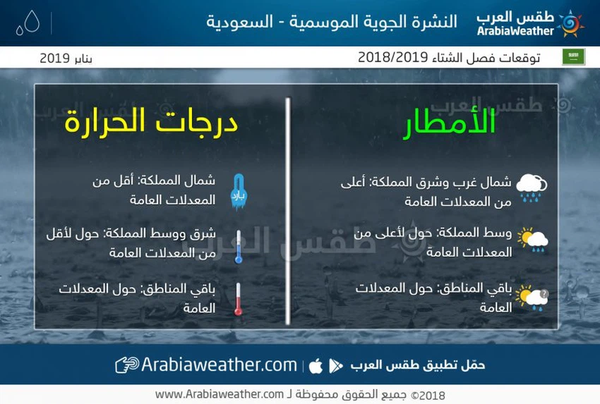 طقس العرب -تٌشير نتائج دراسات فريق "طقس العرب" الفصلية (توقعات طويلة المدى) وتوقعات 2018 من المُتوقع أن يتميز / النمذجة العددية الخاصة بذلك النوع من التوقعات بأن فصل الشتاء الحالي 2019 بمشيئة لله بأنه شتاء بارد خاصة في الشمال مع تجاوز الأمطار معدلاتها الاعتيادية في بعض المناطق بمشيئة الله.