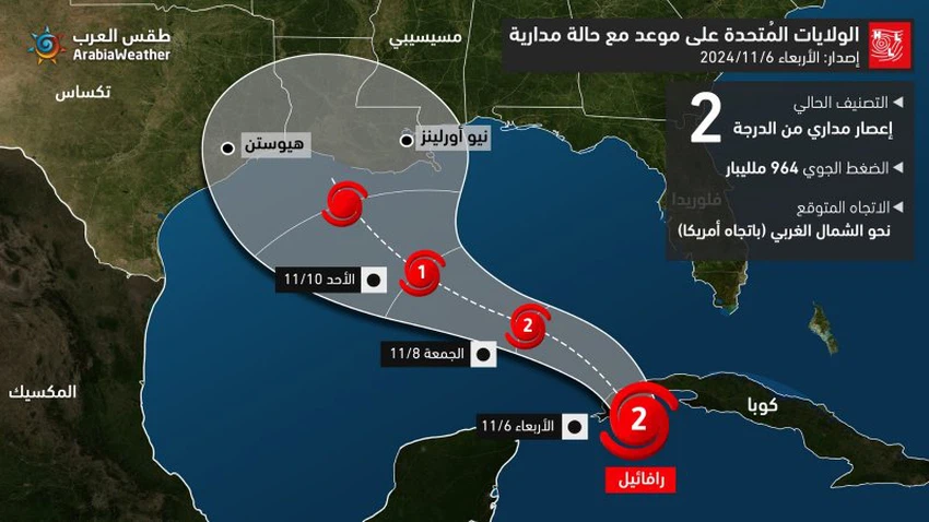 طقس العرب - تُشير أحدث صور الأقمار الإصطناعية و بيانات الإستشعار عن بُعد إلى رصد إعصار مداري تم إطلاق عليه اسم رافائيل و المُصنف من الدرجة الثانية إلى تواجده جنوب غرب كوبا و بسرعة رياح قُصوى حول مركز الإعصار تُقدر بحوالي 160 كم/الساعة مع تبياين كبير في مؤشرات النمذجة الحاسوبية للاتجاه المُتوقع لهذا الإعصار.