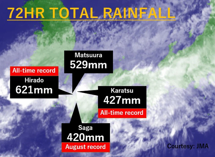 ويُشار إلى أن أكثر من ضعف معدل هطول الأمطار المعتاد طوال شهر أغسطس/ آب، هطل على أجزاء من جزيرة كيوشو الجنوبية على مدار48 ساعة الماضية، مما أدى إلى إغراق الطرق وتسبب في فيضان الأنهار وانهيارات أرضية إضافة إلى تعليق خدمات القطارات.