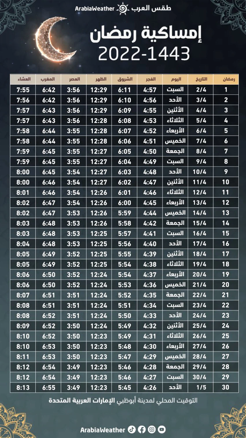طقس العرب - نُهنئ الأمة الإسلامية بقدوم شهر رمضان المبارك، تقبل الله منا ومنكم صالح الأعمال، وهذه إمساكية شهر رمضان لعام 2022 - 1443 وأوقات الأذان وشروق الشمس في دولة الإمارات: