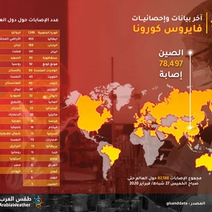 طقس العرب- تزداد حالات الاصابة بفيروس كورونا حول العالم بشكل مطرد، ومازالت الصين تتصدر الدول التي تنتشر بها الإصابة، حيث بلغ عدد الاصابات فيها حتى صباح الخميس 27 شباط الجاري 78,497.