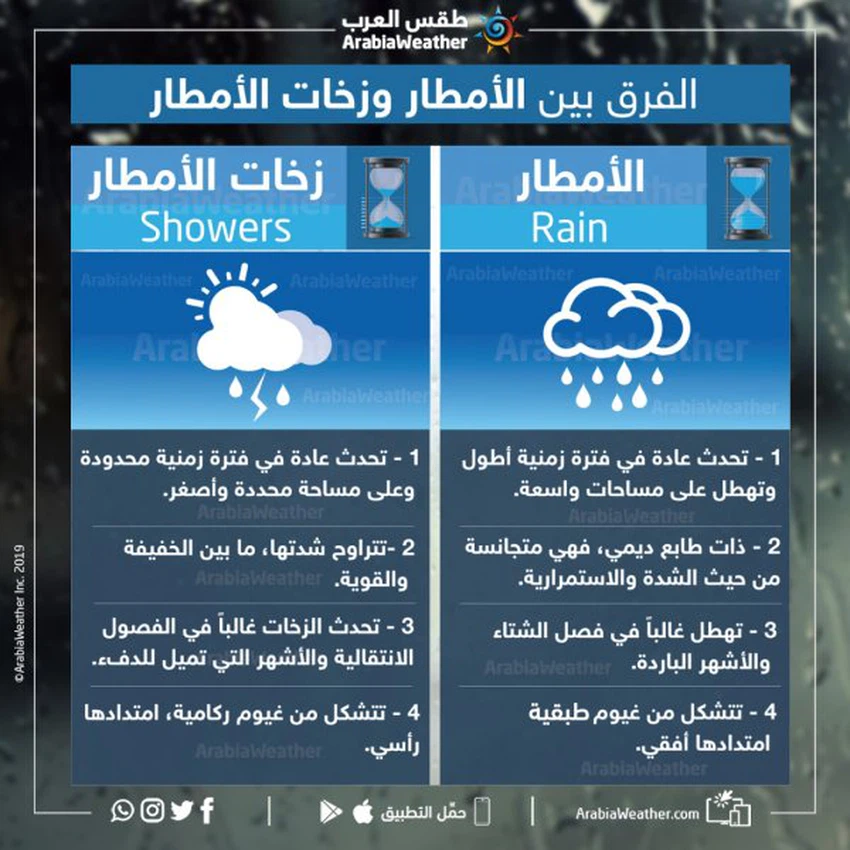 ولا بد من التنويه أن زخات من الأمطار تعتبر أكثر خطرًا؛ حيث ترتفع خلالها فرصة تشكل السيول، ويوضح الانفرغرافيك التالي الفوارق بين مصطلحي زخات من الأمطار والأمطار: