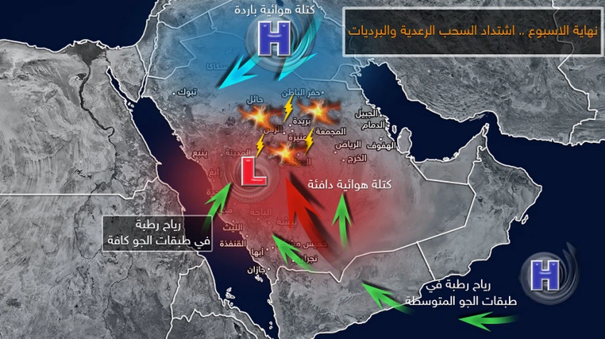 ولا تزال الحالة القادمة مع نهاية الأسبوع أشد قوة من تلك التي تؤثر على المملكة هذه الأثناء، ومن المتوقع أن تترافق الحالة بتساقط البرديات وتشكل السيول في بعض المناطق.