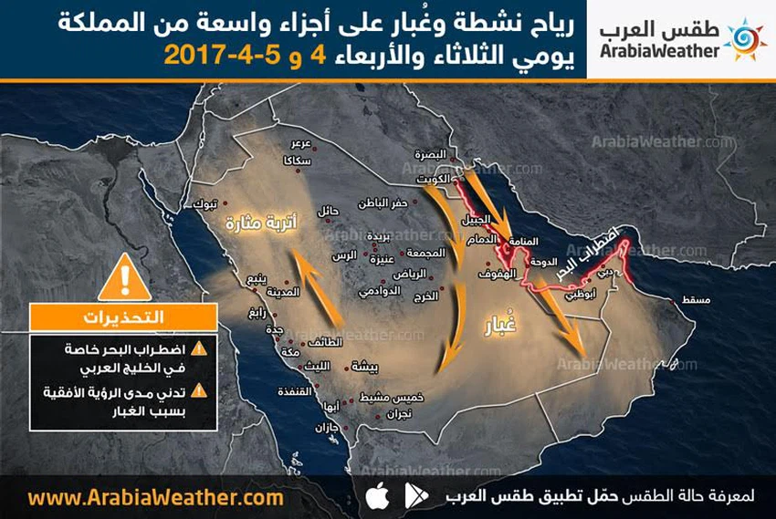 ويُتوقع بمشيئة الله أن تعمل هذه الرياح على إثارة موجة من الأتربة والغبار على المناطق الداخلية من المنطقة الشرقية، وتشمل كل من الإحساء والهفوف، حيث قد تعمل على تدني مدى الرؤية الأفيقة إلى حدود الـ 1000 متر وربما أقل.