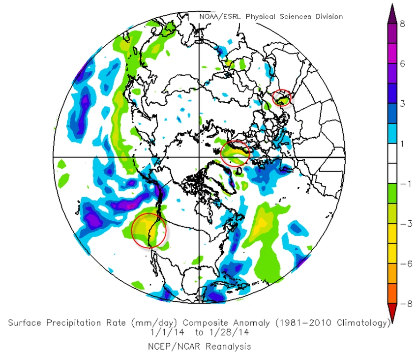 و قد عانت كُل من سواحل شرق المتوسط و سواحل الولايات المُتحدة و كندا المُطلّة على المُحيط الهادئ من انحباس الأمطار و غياب الفعاليات الجوية خلال أغلب فترات شهر يناير، في ظاهرة جويّة مُتطرفة، حيثُ أن هذا الشهر يُعتبر في الأوضاع الطبيعية أكثر الأشهُر أمطاراً في هذه المناطق.