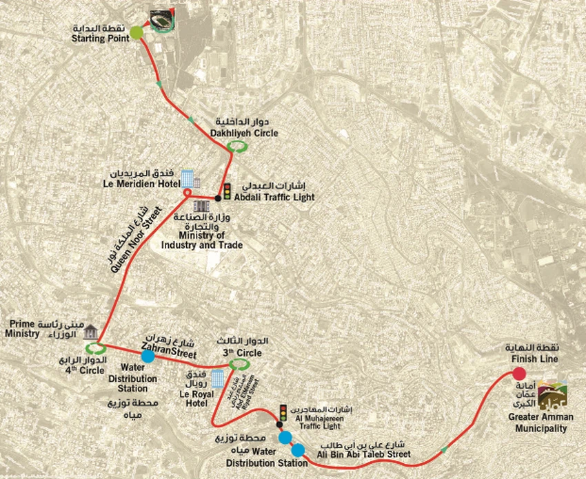ينطلق سباق الـ42.195 كيلومتراً من أمام مبنى أمانة عمّان الكُبرى الواقعة في قلب العاصمة عمّان و تحديداً في منطقة رأس العين.