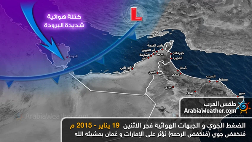 تعبُر البلاد مع ساعات فجر الإثنين جبهة هوائية باردة، حيثُ ينتظم هُطول الأمطار في أجزاء واسعة من البلاد وتكون الأمطار غزيرة أحياناً ومترافقة مع حدوث الرعد وتساقُط زخات من البرد بدءاً من المناطق الساحلية المُطلة على الخليج العربي وتمتد تدريجياً نحو المناطق الداخلية.
