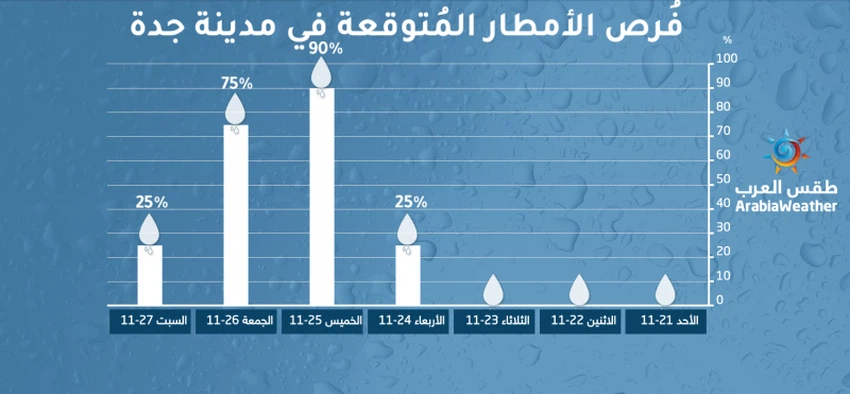 وتالياً الرسم البياني للنسبة المئوية لفرصة هطول الامطار على مدينة جدة خلال الأسبوع الحالي: