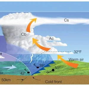 وعند اندفاع الجبهة الهوائية الباردة يقوم الهواء البارد برفع الهواء الساخن الأقل كثافة إلى أعلى، مما يؤدي إلى تشكل الغيوم الرعدية ونشاط الرياح وانخفاض الحرارة وارتفاع الضغط الجوي.