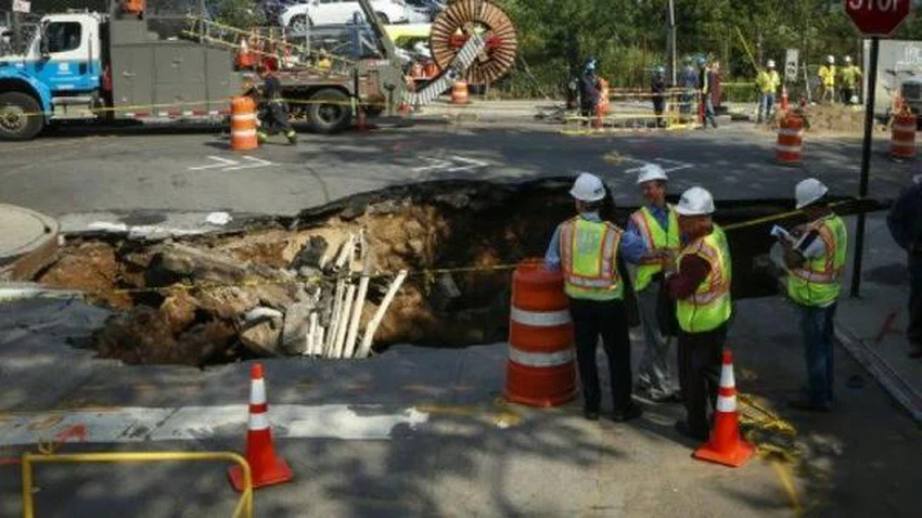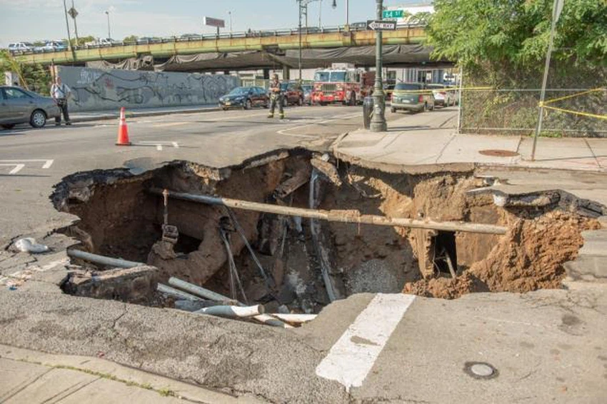 وظهرت في الفجوة أنابيب ممزقة وقطع إسفلت مسحوقة عند تقاطع الجادة الخامسة والشارع 64.