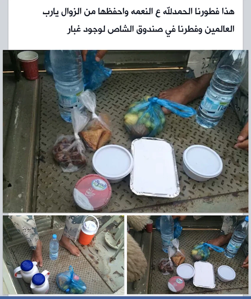 وقال أحد الحراس من النشطاء على موقع الفيس بوك، لوجبة الإفطار التي تناولها أفراد حرس حدود أثناء تأديتهم عملهم عبر الموقع" "هذا فطورنا الحمد للّه على النعمة واحفظها من الزوال.. يا رب العالمين".