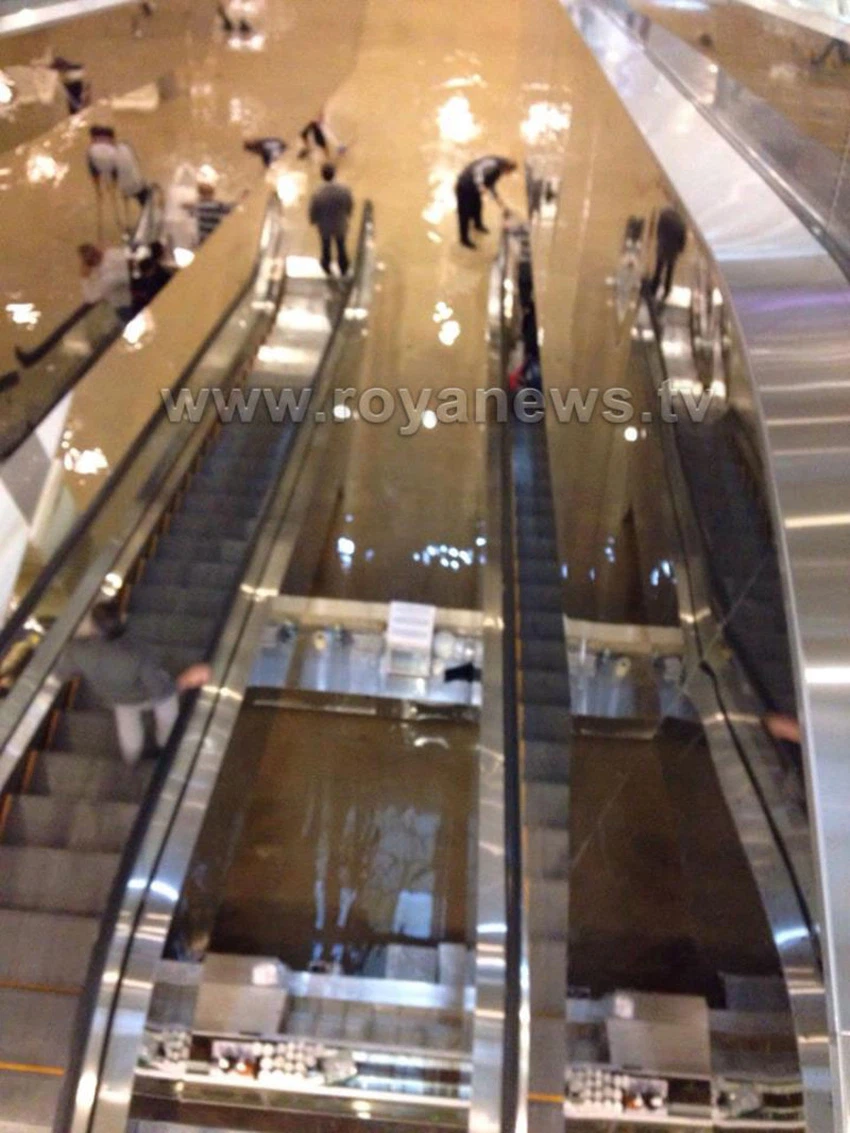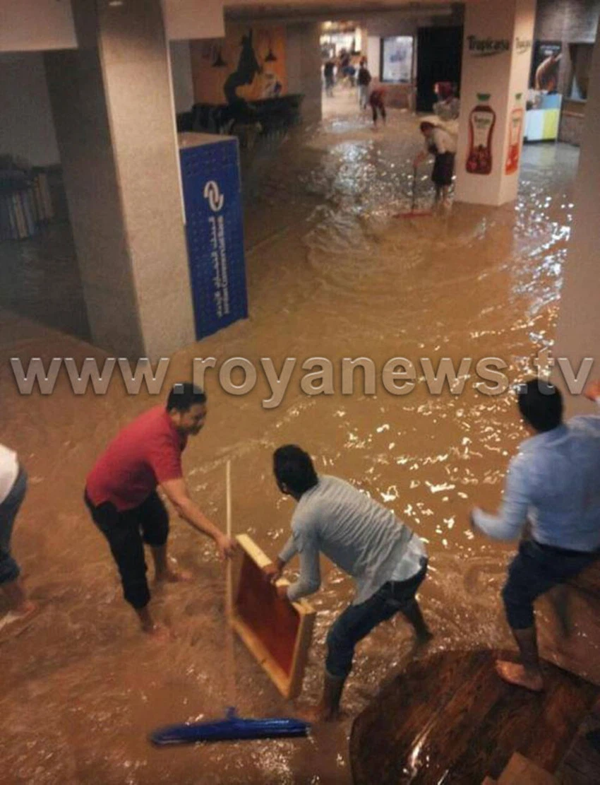 وتظهر الصور التي نشرهاموقع رؤيا نيوز، أحد طوابق المول وقد غمرته مياه الأمطار، كما تظهر أخرى عمال  الصيانة في المول وهم يقومون بالتخلص من مياه الأمطار التي وصلت عند الدرج الكهربائي.