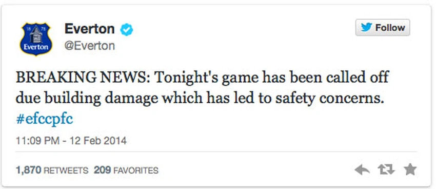لحظة إعلان صفحة نادي إيفرتون عن إلغاء المباراة على تويتر