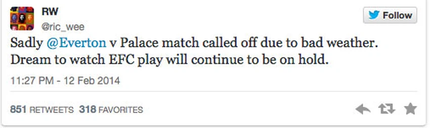 وكان ذلك يعني انتهاء حلم المُشجع بطريقة مأساويّة،فكتب على تويتر " للأسف تم إلغاء المباراة بسبب سوء الأحوال الجويّة، حلم مُشاهدة إيفرتون سيبقى قيد الإنتظار.