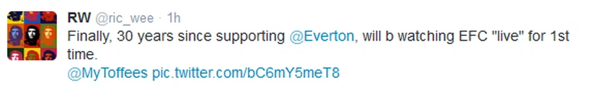 و قد كتب المُشجع الماليزي بفرحة على حساب تويتر الخاص به " و أخيراً بعد 30 سنة من تشجيع نادي إيفرتون، سأقوم بمشاهدتهم مباشرةً للمرّة الأولى.