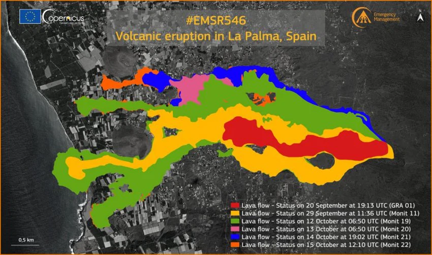 وقالت السلطات إن العدد الاجمالي للسكان الذين تم إجلاؤهم من مساكنهم بلغ 6800 شخص، وتغطي الحمم 674 هكتارًا من أرض الجزيرة حتى الآن بعد أن أحرقت مئات المنازل ودمرت مزارع الموز في المنطقة، وتظهر الصورة (أدناه) تدفقات الحمم البركانية عبر الجزيرة وصولا إلى مياه المحيط، وذلك منذ بداية ثورانه وحتى تاريخ (15 أكتوبر).