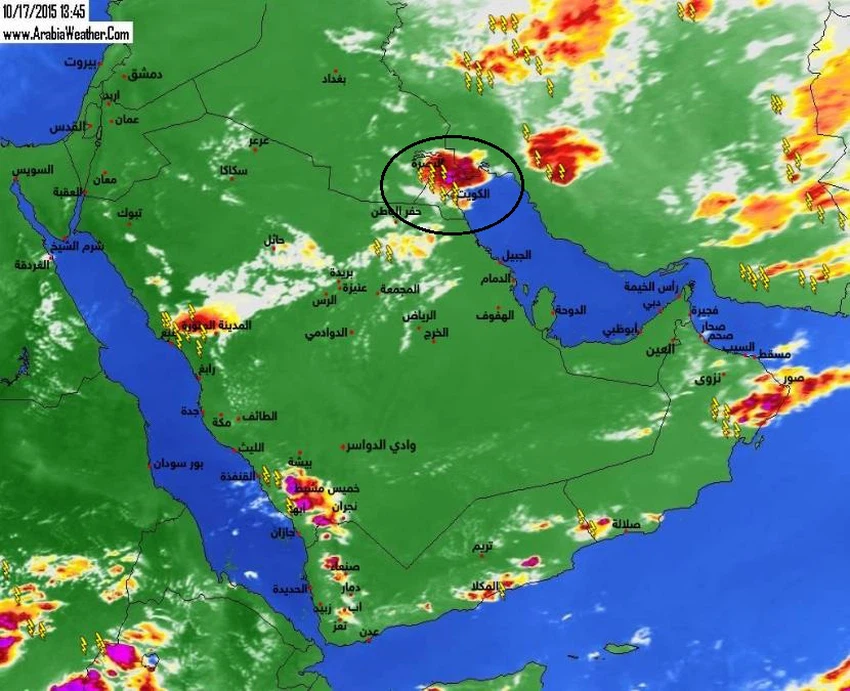 حيث حذر طقس العرب من خطر تدني مدى الرؤية الافقية، ويعد السبب الأكبر لما حصل بفعل الرياح الهابطة المرافقة للسحب الرعدية والتي تعمل على تدني مفاجئ في مدى الرؤية الافقية بفعل الغبار الكثيف خاصة في الأماكن الصحراوية، الخريطة التالية تمثل صور الغيوم المتقطة عبر الاقمار الاصطناعية حيث أثرت على دولة الكويت.