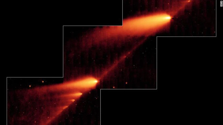 (تُظهر صورة الأشعة تحت الحمراء من تلسكوب تابع لناسا المذنب 73P / SW بعد أن تفتت، الأجسام الشبيهة باللهب هي شظايا المذنب وذيولها، في حين أن مسار المذنب الذي يحتوي الغبار والحبيبات الترابية هو الخط الفاصل بين الشظايا)